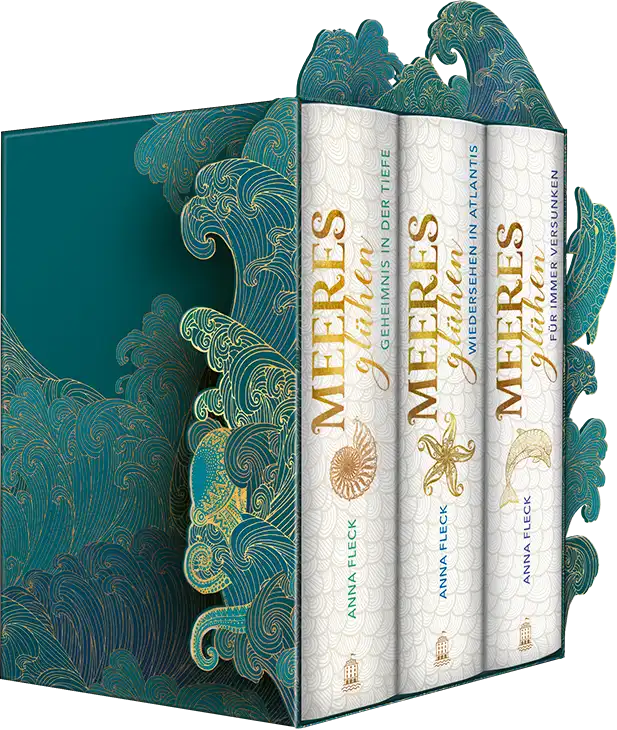 Die »Meeresglühen«-Trilogie – jetzt im aufwendig veredelten Schmuckschuber mit Pop-out-Designelementen. Mit drei neuen Geschichten aus Atlantis und handsignierter Character-Card von Spiegel-Bestseller-Autorin Anna Fleck.